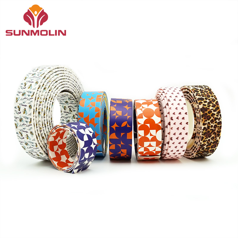 双牧林印刷花纹包胶织带; 防水、耐磨、耐脏、防霉、防菌、强度高、剥离强度高; 花色包胶织带不串色,不脱色,不染色; 宽度、厚度均可定制。